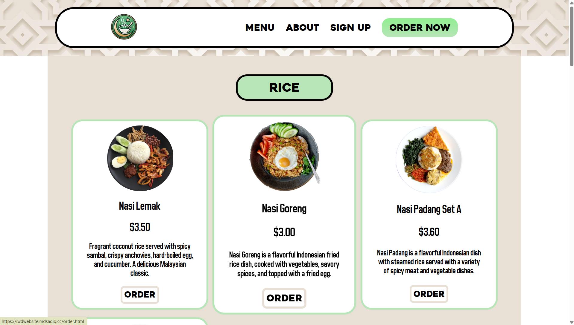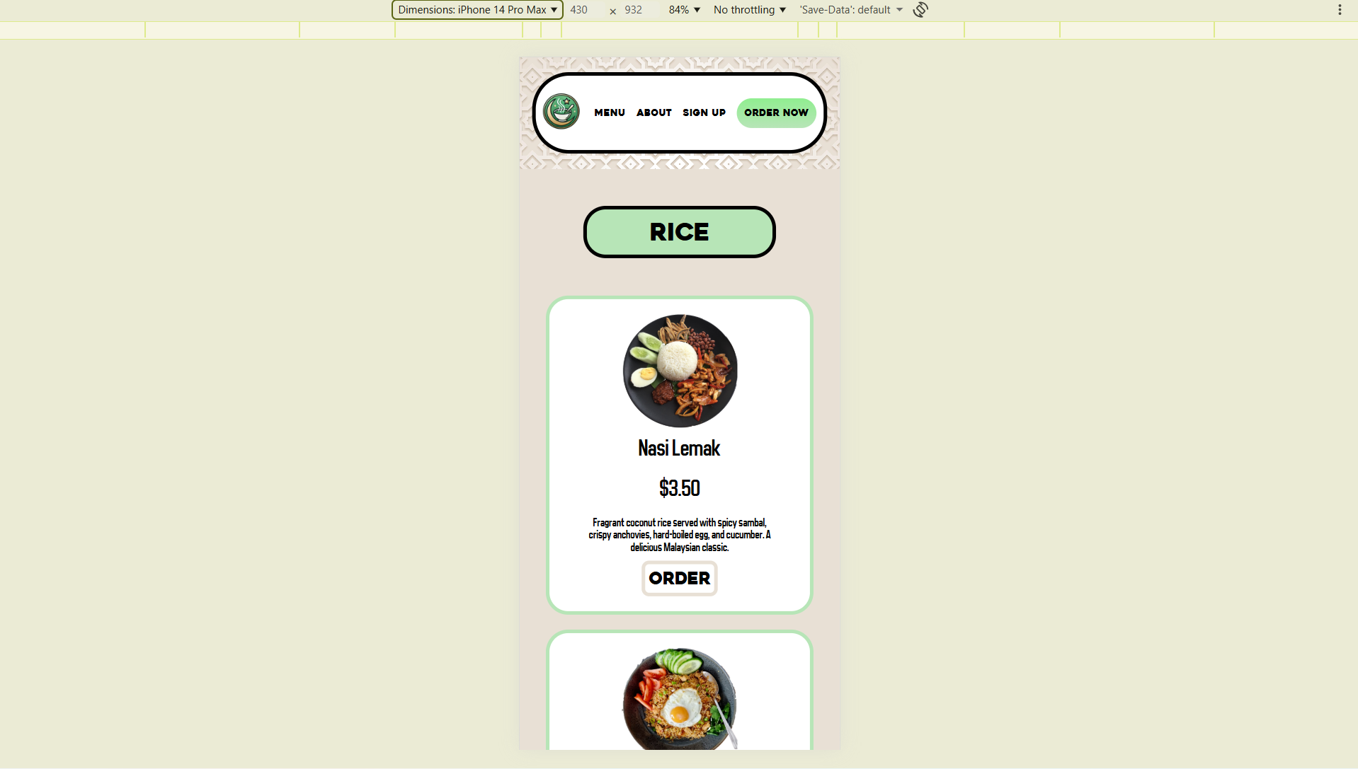 The menu page is split into 3 categories: rice, noodles, and prata. I used flex boxes to arrange things into a nice layout, this will also help with media query.