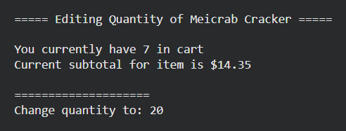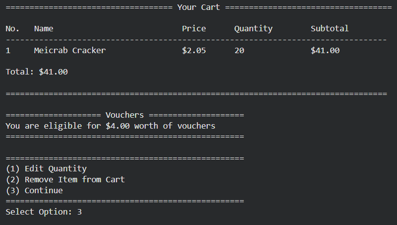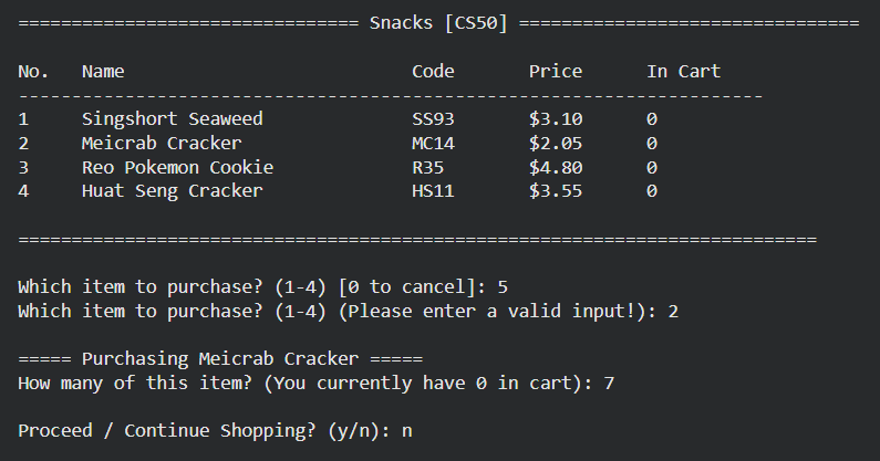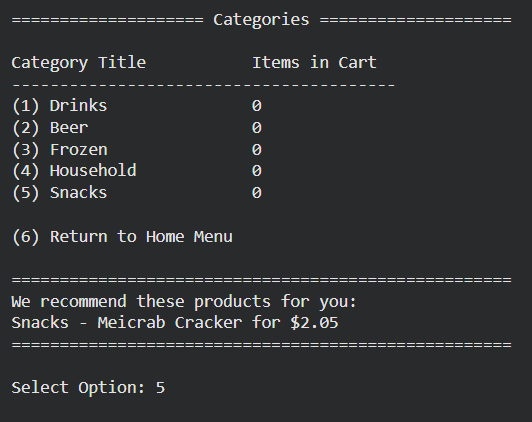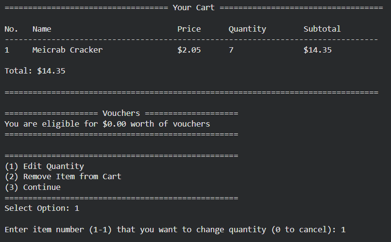After selecting a category, the interface displays the items, their codes, price, and how many the user has added to cart. There is also a validity check so users cannot enter invalid item numbers or values.
