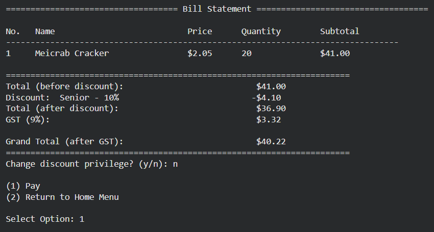 Finally at the end of the shopping experience, a comprehensive bill statement is generated stating the total, discounts, and tax.